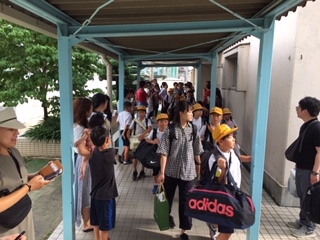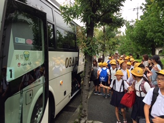 児童と付添職員9名は、バス2台に分かれて乗車しました。予定どおり8時に長吉を出発しました。たくさんの保護者・ご家族の方々に見送っていただきました。。中国自動車道の「赤松PA」に向かいます。