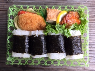 冷たい山の水で手を洗い、全員でいただきますをしました。昼食のメニューは「おにぎり弁当」でボリュームたっぷりで、みんな満足。