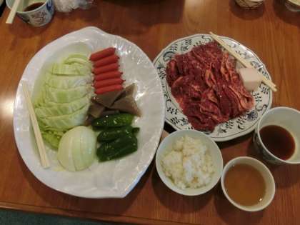 18時45分、2日目の夕食は「焼肉」でした。例年は但馬地方の名物料理「かも鍋」ですが、今年度は初めて焼肉にしました。食堂は煙っていましたが、自分たちで焼き方を工夫して、おいしくいただきました。