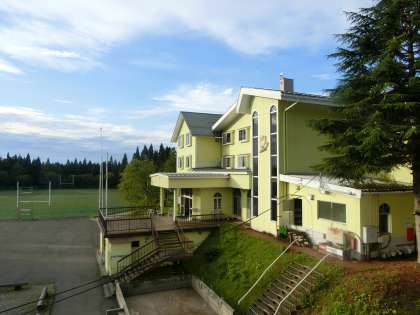 写真は今朝に撮影したもので、左は昨日登山をした「高坪山」、右は宿舎の「かねいちや別館」です。