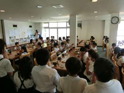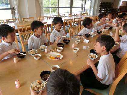 11時45分、「林間学習最後の昼食」をいただきました。食事係のあいさつで、「いただきます」をしました。