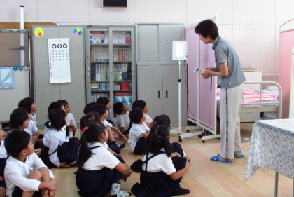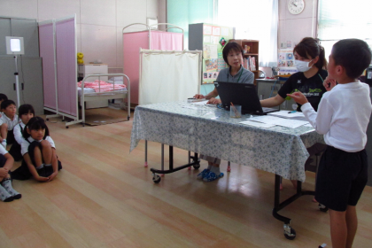 1年生は視力検査をしました。はじめに保健室の先生から検査の仕方を聞きましたが、1学期にもしているのでみんな覚えていたようです。順番に検査して環の切れている方向を答えたり指を指したりしていました。