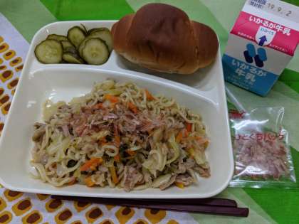 8月27日(火)、2学期最初のこんだては「和風焼きそば、きゅうりのゆず風味、1/2黒糖パン、牛乳」です。