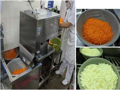 機械にベルトや刃を取り付け、野菜を通すと、カットされて出てきます。写真は、焼きそばに使用するたまねぎ(約18kg)とにんじん(約5kg)を細切りにしたところです。給食ではたくさんの野菜を使うので、野菜の種類や切り方、量などによって、手作業で切るか、スライサーを使用するかを決めています。