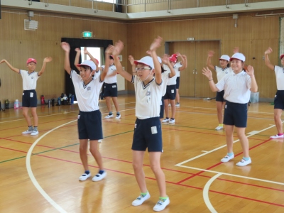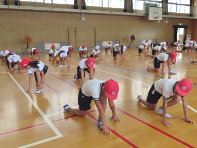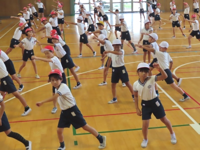 8月30日(金)3限、4年生は体育館で、運動会「団体演技」の練習をしていました。大阪の暑さ指数は「厳重警戒」(28〜31度)の予報が出されており、体育館では10台の送風機を全部稼働させて練習しています。