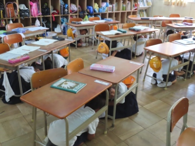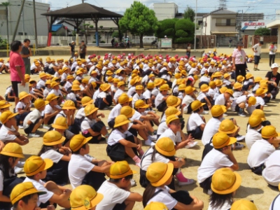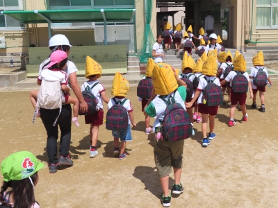 地震が発生して1年生は机の下に避難【写真左】しました。揺れがおさまったので、運動場に避難しました。今日は3分47秒で避難を完了し、4月の避難訓練よりも1分20秒も早く避難できました。今日は津波訓練もあるので、長吉幼稚園の園児も「防災ずきん」をかぶって本校に2次避難し、津波に備えて校舎の3階に避難【写真右】していきました。