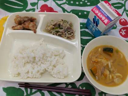 9月9日(月)のこんだては「鶏肉のてり焼き、みそ汁、野菜いため、ごはん、牛乳」です。