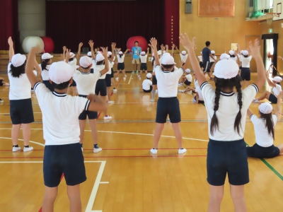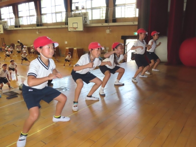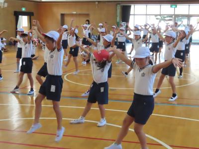 曲の歌詞やリズムも覚えてきて、だんだんと踊れるようになり、少しずつ自然と笑顔がでるようになってきました。その中でも特に上手な児童は、お手本として体育館の舞台の上【写真中】で踊ってみました。それがよい刺激になり、意欲をもって頑張る児童がたくさんいました。