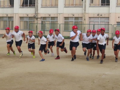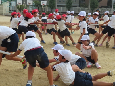 9月11日(木)6限、5年生は運動場で、運動会団体競技の「棒引き」の練習をしました。