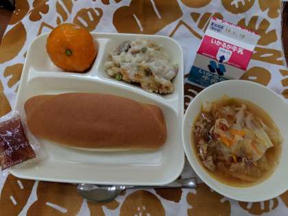 9月12日(木)のこんだては「豆乳マカロニグラタン〔米粉〕、トマトスープ、冷凍みかん、コッペパン、いちごジャム、牛乳」です。