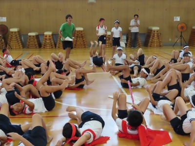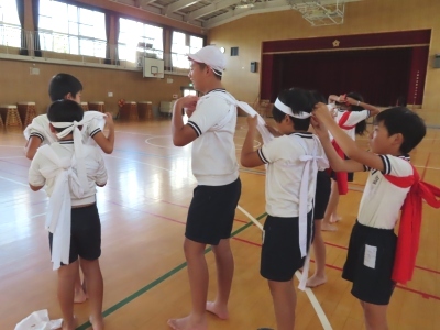 体育館に集合して、赤組・白組関係なく、タスキやハチマキをお互いに着けてあげていました。体育館でエール交換や寸劇・団長対決【写真中】の練習のあと、運動場に移ってひととおり練習をしました。まだセリフが途切れたり、息が合わなかったりする場面もありますが、徐々に声も出て気合が入ってきています。