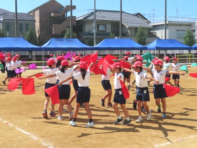 4年生の半数ずつが別々に、入場から演技・ダンス、退場まで一とおり流した後、全員で合わせました。運動場をいっぱいに使って、表現していました。最後は全員が笑顔でフィニッシュ。当日の演技をお楽しみに。