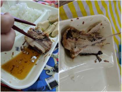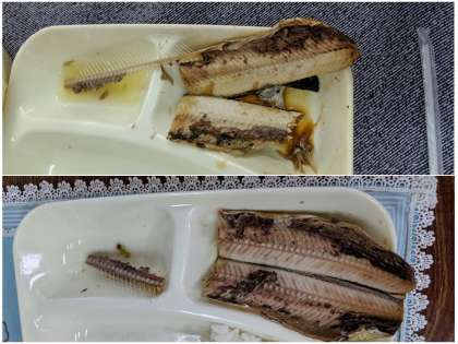 1年生【写真中】も先生に食べ方を教えてもらって、上手に骨をよけて食べていました。そして6年生【写真右】はさすが!とてもきれいに食べていました。