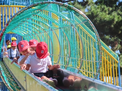 昼食後は、北児童遊戯場のすべり台や複合遊具で元気いっぱい遊びました。13時20分に集合して、浜寺駅前から貸切のチンチン電車に乗って長吉に向かいました。