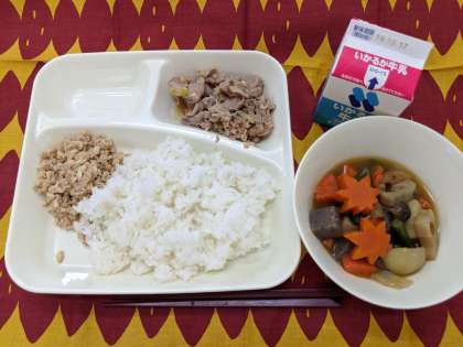 10月11日(金)のこんだては「豚肉のねぎじょうゆ焼き、ふきよせ煮、ツナ大豆そぼろ、ごはん、牛乳」です。