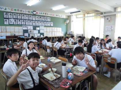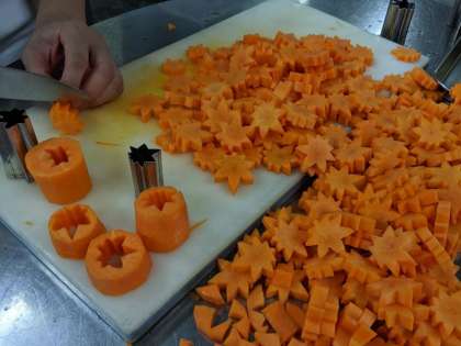 ふきよせ煮は、さまざまな木の葉が風で吹き寄せられた様子に見立てて、いろいろな具材を取り合わせた煮ものです。れんこん、さといも、しめじなど、秋らしい食材を使っています。より秋らしく、にんじんを紅葉型に抜いてもらいました。たくさん作ってもらったのですが、大きな釜で煮るうちに煮くずれてしまい、きれいな形で残ったものは少なかったようです。当たった人はいるでしょうか?