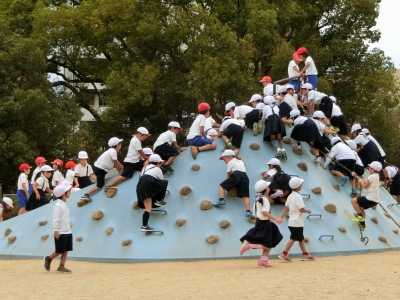 芝生広場で班ごとにお弁当をいただいた後、「大阪市立自然史博物館」を訪れました。館内では恐竜の骨格や魚類、昆虫など自然界にいる生き物の展示を見たり、触ったりしました。帰りに少しだけ遊具【写真右】で遊び、帰路につきました。
