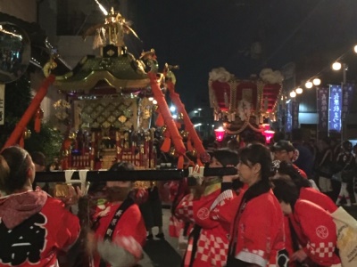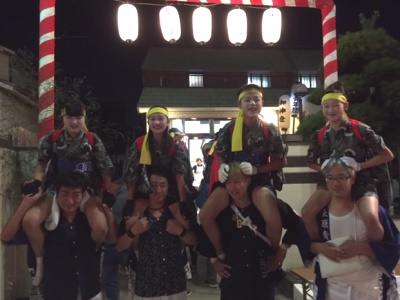 2トンの重量がある「布団太鼓」は、青年団や青友会、長友会、長朗会など皆さんに担がれて、「ドンデコ・ドンでコ・ドッテンコ」の掛け声で神社の参道を曳行しました。長吉の子どもたちも、乗り手となって祭りに参加をしました。「女性神輿」は、本校の保護者や教員も入って、一緒に担ぎました。