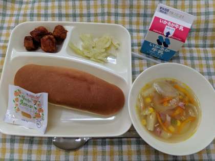 10月15日(火)のこんだては「まぐろのオーロラ煮、ベーコンとじゃがいものスープ、キャベツのゆずドレッシング、コッペパン、アプリコットジャム、牛乳」です。