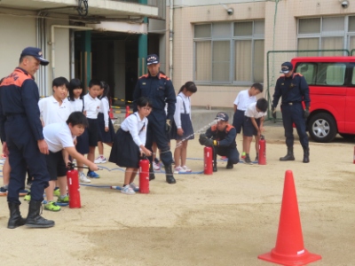 運動場での「消火器体験」では、消火器のホースの先をしっかりと消火の的に当てる練習をしました。防災学習を通して、煙の中での避難や消火器の正しい使い方を体験することができました。