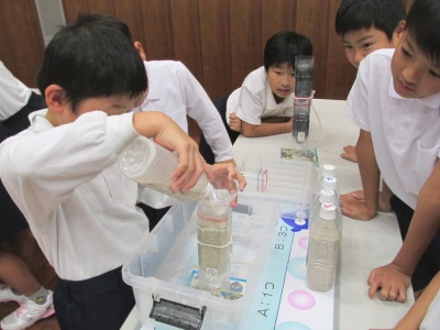 屋外施設の見学の後は会議室に移動し、砂ろ過・りゅう状活性炭による実験【写真右】を行いました。水道水がつくられるしくみや浄水場で働く人々の様子を学習し、水の大切さを学ぶことができた社会見学でした。