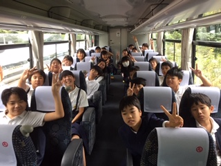 先頭の3号車では出発をしてすぐにバスレクのカラオケが始まり、ずっと歌い続けていました。放送委員と担当教員で編集したオリジナルの音楽CDをバスに持ち込んでいます。