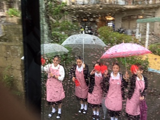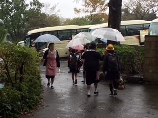 退所式の後、雨足が強くなってきたので、ホテルのスタッフの方に一人ずつ傘に入れていただいて、バスに乗り込みました。8時50分、ホテルの方々に赤いハンカチを振って、見送っていただきました。