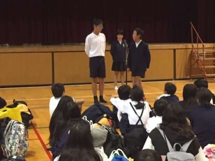 「帰校式」は講堂で行いました。参加した全員が「一生の思い出となる修学旅行」になったと思います。子どもたちは、「楽しい思い出と学び」をいっぱいお土産に持って帰ってきました。残りの小学校生活5ヶ月を有意義に過ごしてください。