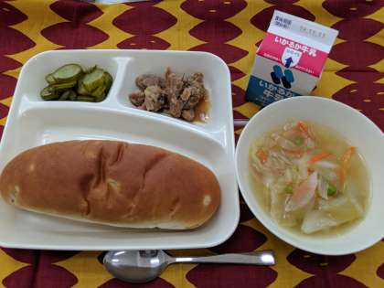 11月5日(火)のこんだては「豚肉のデミグラスソース、スープ、きゅうりのサラダ、おさつパン、牛乳」です。