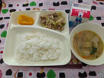 11月8日(金)のこんだては「豚肉とまいたけのいためもの、つみれ汁、かぼちゃういろう、ごはん、牛乳」です。