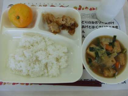 「あげどりのねぎソースかけ、あつあげとはくさいのうま煮、みかん、ごはん、牛乳」です。