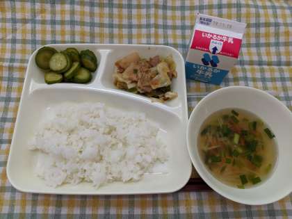 11月13日(水)のこんだては「ホイコウロー、中華スープ、きゅうりの辛みづけ、ごはん、牛乳」です。