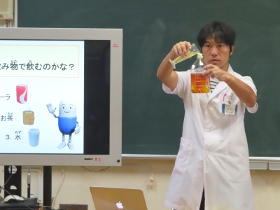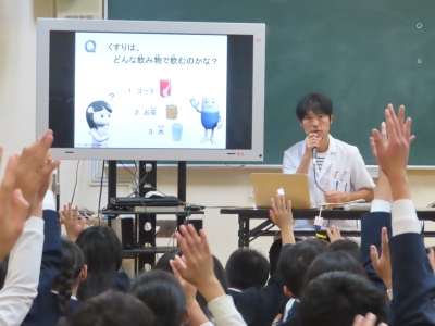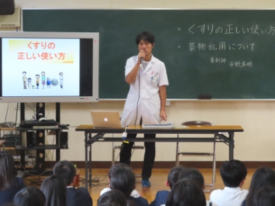 薬には主作用と副作用があること、医師や薬剤師の指示に従って正しく服用することを学びました。シロップ剤の薬にジュースを入れた場合の実験など、わかりやすくお話していただきました。また、薬物乱用防止のお話では、違法薬物の断り方や元気な心と体をつくるためは、規則正しい生活を送る必要があることなどを教えていただきました。