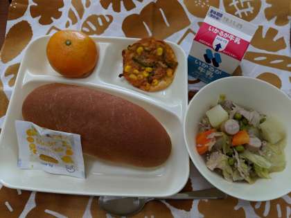 11月19日(火)のこんだては「豚肉とキャベツのスープ煮、変わりピザ、みかん、コッペパン、マーマレード、牛乳」です。