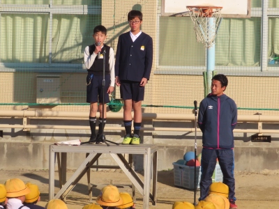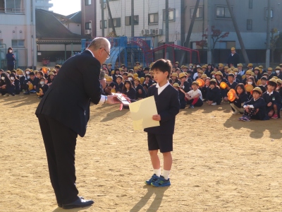 12月9日(月)、今朝はこの冬一番の冷え込みで、学校北グランド【写真中】は霜が降りて真っ白でした。始業前の児童朝会では、読書感想文と書道の賞状伝達の後、校長先生から「ポケットハンド」について、お話がありました。今朝の登校時、正門前で「ポケットから手を出しましょう」と言われた児童は、15人いました。