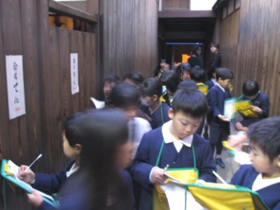 館内10階では、江戸時代の街並を上から見学【写真左】しました。そして9階の「大阪三丁目の門」をくぐり、動物探しや道具探しなど、ワークシートを活用しながら「なにわの町家」を探訪しました。トイレやお風呂、台所、部屋の様子など、現代とは全く違う生活様式にびっくりしていました。帰りは日本一長い「天神橋筋商店街」を南森町まで歩いて見学しました。今後の社会科の学習に活かしたいと思います。