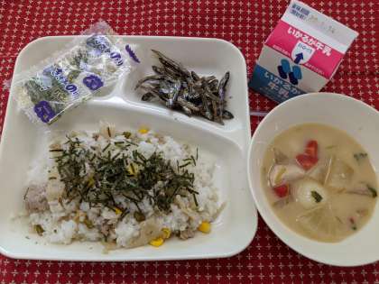 1月8日(水)、新年最初の給食は正月の行事こんだてです。「れんこんのちらしずし、ぞう煮、ごまめ、牛乳」です。
