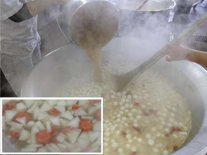 ぞう煮は、かつおぶしでだしをとり、白みそを使った関西風です。一口サイズの白玉もちが入っています。ぞう煮の金時にんじんで梅の花の形のラッキーにんじんを作ってもらいました。