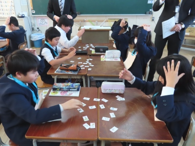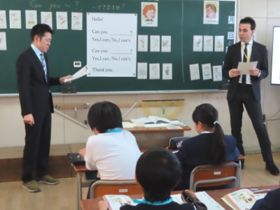 1月10日(金)5限、大阪市教育委員会の外国語活動訪問研修を兼ねた「外国語活動授業参観」を行いました。文部科学省の外国語教材を使って、C-NETと一緒に「Can you〜?」(できること)の学習をしました。