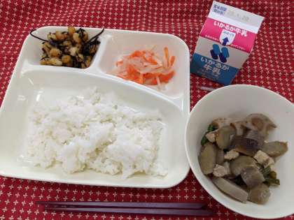 1月14日(火)のこんだては「筑前煮、ひじき豆、紅白なます、ごはん、牛乳」です。