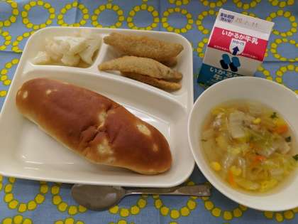 2月5日(水)のこんだては、「わかさぎフライ、はくさいのスープ、カリフラワーのサラダ、おさつパン、牛乳」です。