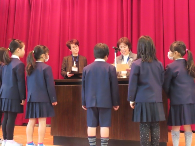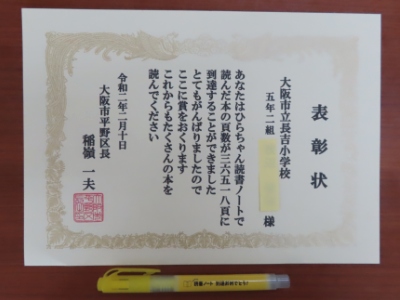 2月10日(月)始業前、体育館に全校児童が集合し、平野区副区長から「ひらちゃん読書ノート」の表彰をしていただきました。平野区役所ではこどもの読書習慣の定着のために、3年前から区内小学生を対象に読書ノートを配布し、1年生から4年生は100冊以上、5・6年生は3,000ページ以上読んだ児童を表彰しています。