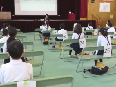 5年生は、3月24日修了式以来、50日ぶりの「登校日」です。 講堂【写真左】に集まり、担任紹介の後、感染症に関連して三密やソーシャルディスタンスについて、お話がありました。