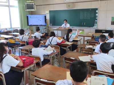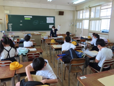 5年生は1クラス38人のため3分割にし、1組・2組・学習室に分かれました。学習課題等の提出や大阪府からの「図書カード」や文部科学省からの「布マスク」の受渡しなどを行いました。