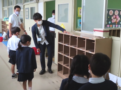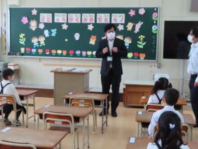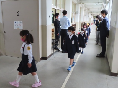 教室の前では、靴箱の場所を確認してから教室に入り、自分の席に初めて座りました。最後は、学級担任が自己紹介をし、講堂に戻っていきました。終了後は、朝顔の植木鉢を持って帰っていただきました。