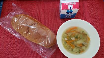 6月4日(木)のこんだては、「パンプキンパン(個包装)、豚肉とキャベツのスープ、牛乳」です。