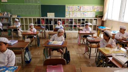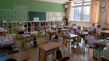 どの教室でも、前をむいて、静かに給食を食べています。楽しいおしゃべりはできませんが、味わって食べてくれているようです。分散登校なので、パンとおかずと牛乳の献立ですが、「おいしかった」とよく食べてくれています。
