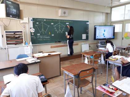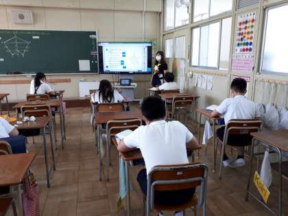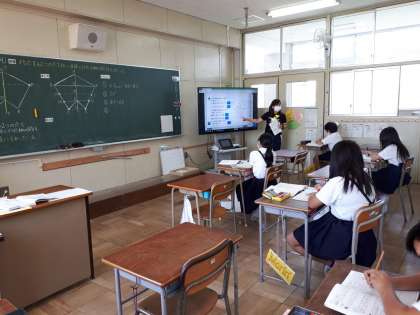 先生が黒板にかいた図を使ったり、大型テレビに映されたデジタル教科書を見たりしながら学習を進めました。今日学習した線対称な図形の性質を使って、線対称な図形のかき方を考える学習へとつながります。