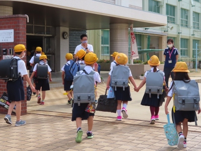 6月15日(月)、新1年生は初めて、8時5分に登校してきました。新しくなったグレーのナップランドを背負っていました。