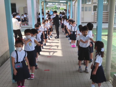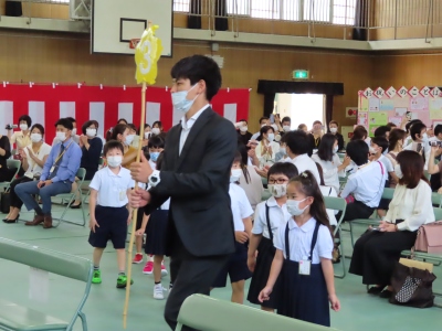 2時間目にこれまで延期していた令和2年度「入学式」を挙行しました。今日初めて会うお友だちもいる中、まっすぐ並んで入場できました。まったくのぶっつけ本番でしたが、緊張することなく、元気に入場しました。保護者の参列は任意(自由)でしたが、多数ご出席いただきました。